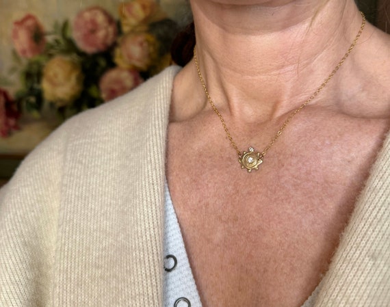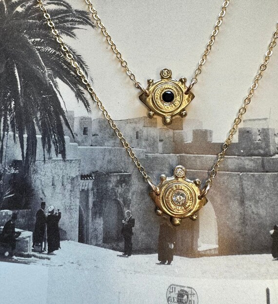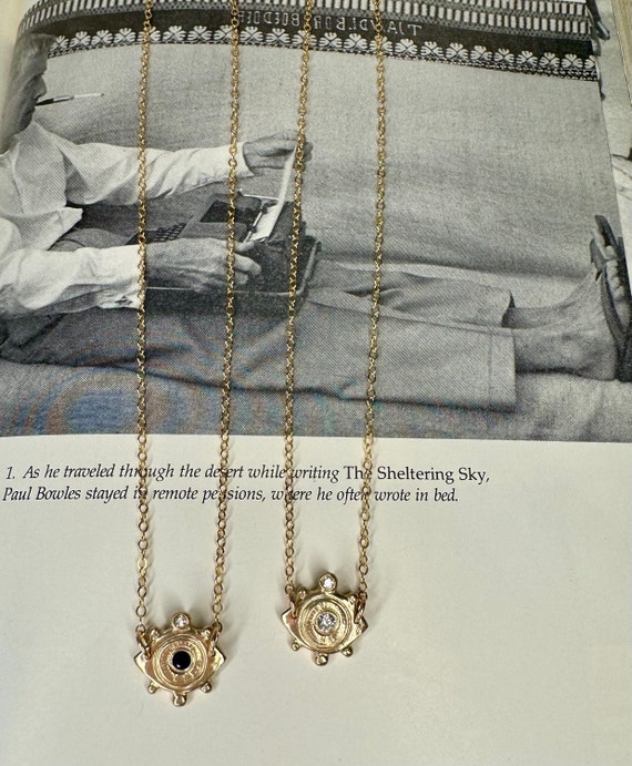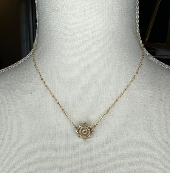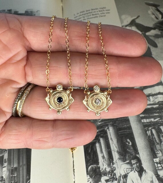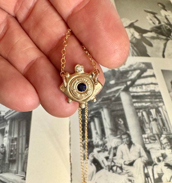 Evil eye, lover’s eye, all-seeing eye, mati, buri nazar; whatever you like to call it and whether or not you believe it to be a protective amulet, this pendant is a stunner. This stylized eye is molded from our hand-carved piece, made in golden-hued bronze and features either a sparkling clear cubic zirconia or dark blue sapphire center stone with accent at top of a smaller cubic zirconia gem. The chain is 14k gold-filled and is adjustable length from 16-18 inches. The pendant measures just over a half inch.