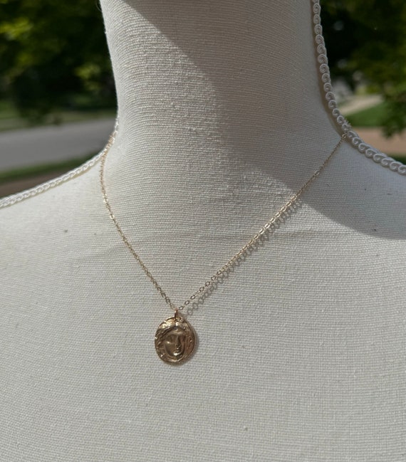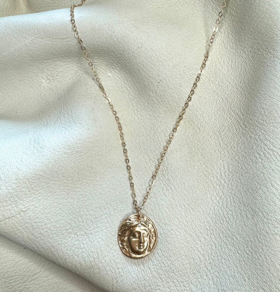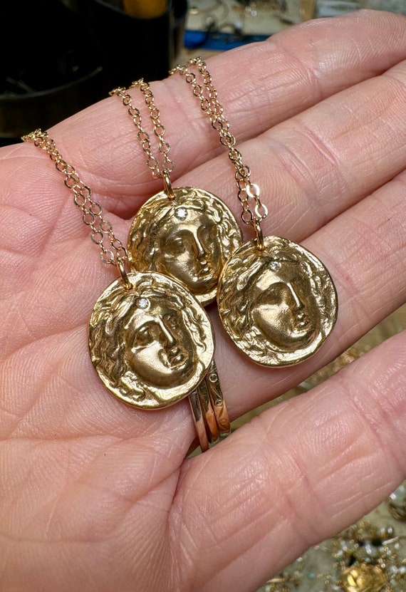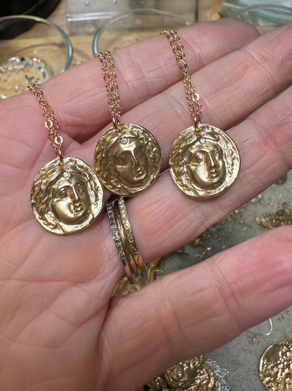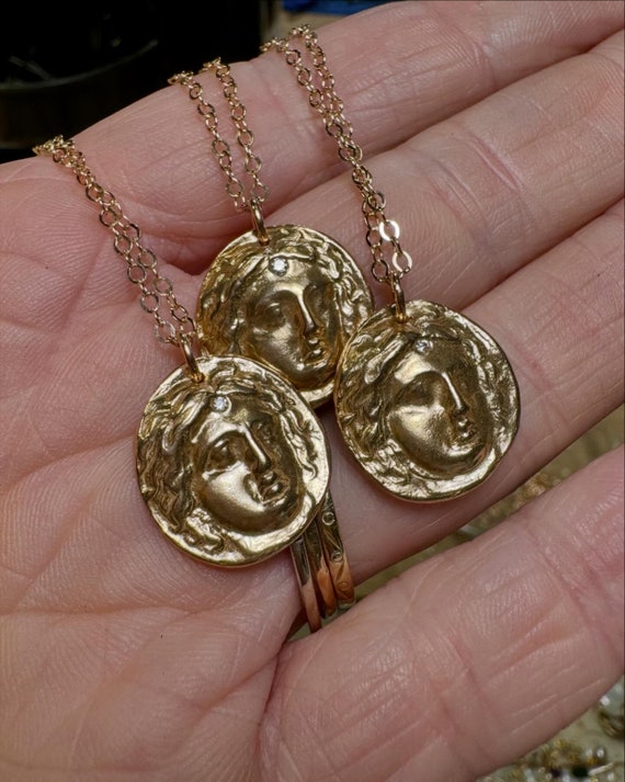 The golden bronze “Athena’s Wisdom” amulet features the beautiful visage of the goddess Athena and is studded with a tiny sparkling cubic zirconia in her third eye. Athena was the Greek goddess of wisdom, craft and warfare. She is seen as the embodiment of rationality, strategy and heroic endeavors. The 14k gold-filled chain is adjustable from 16 to 18 inches. Medallion is approximately 5/8” off round shape.