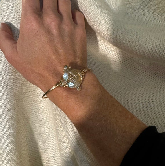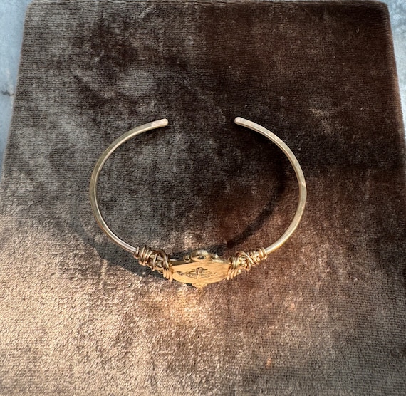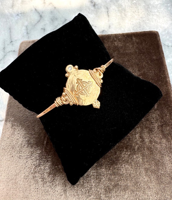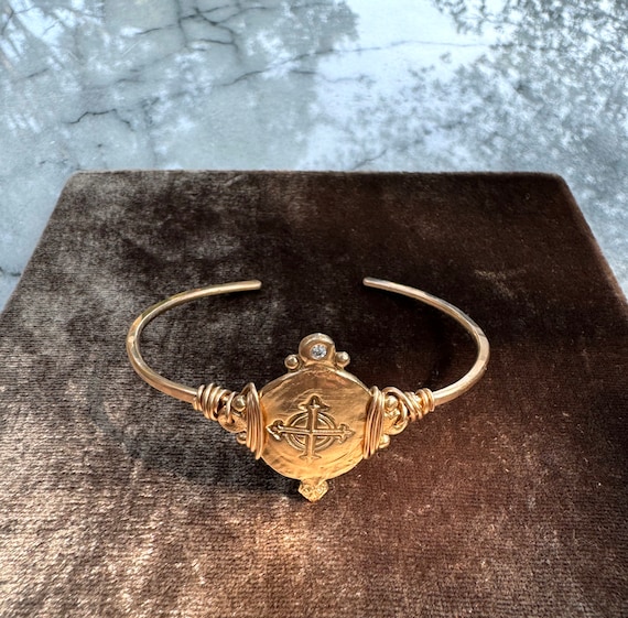 The golden bronze Renaissance cuff bracelet features a hand carved coin medallion with an equilateral cross and tiny cz stud accent. Slightly adjustable by bending the ends of the cuff.