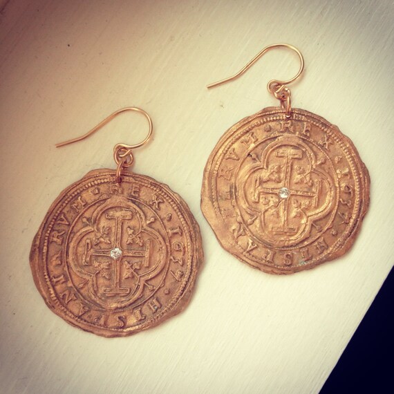 These Earrings feature bronze replicas of 1637 Spanish coins accented with sparkling cubic zirconia gems.