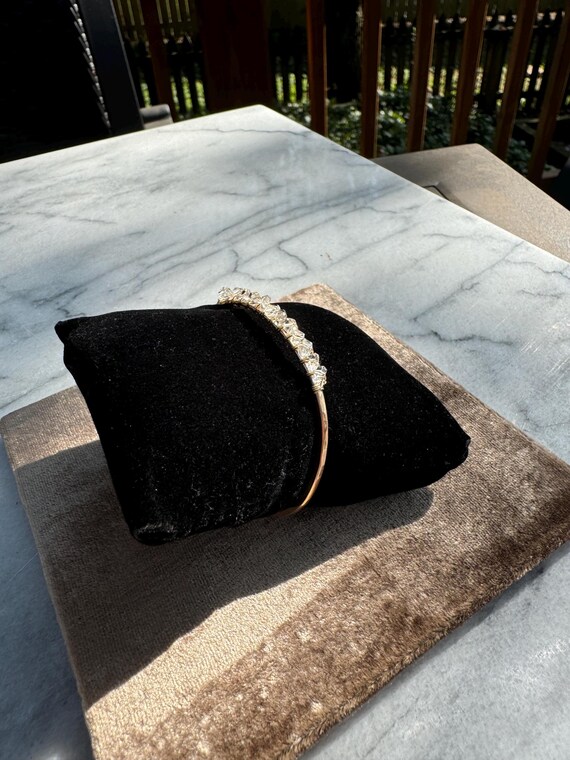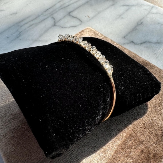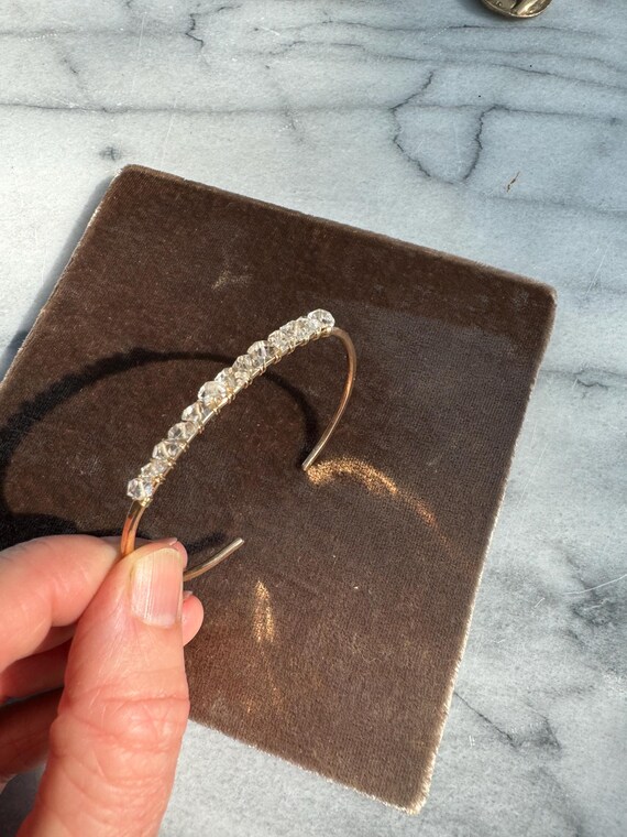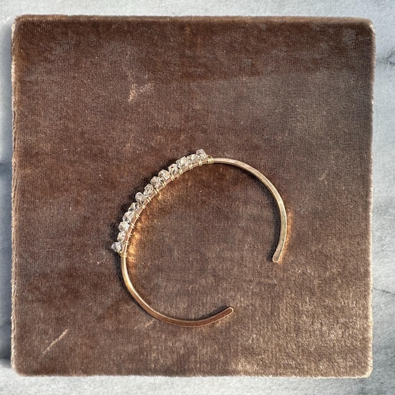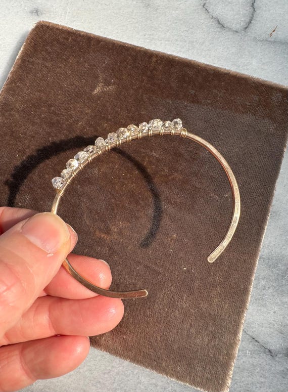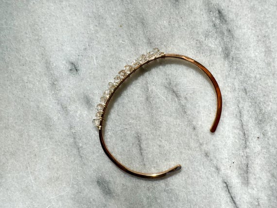 This hand formed and hammered cuff features a sparkling row of natural, clear double-terminated crystal quartz gemstones. Slightly adjustable by bending the ends of the cuff.