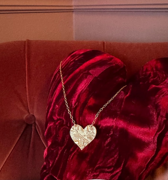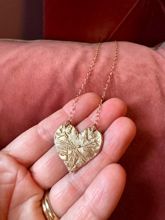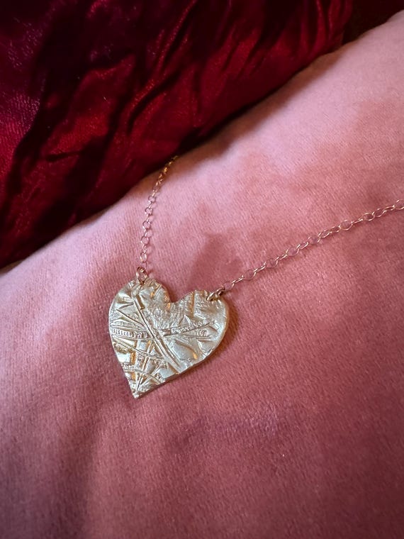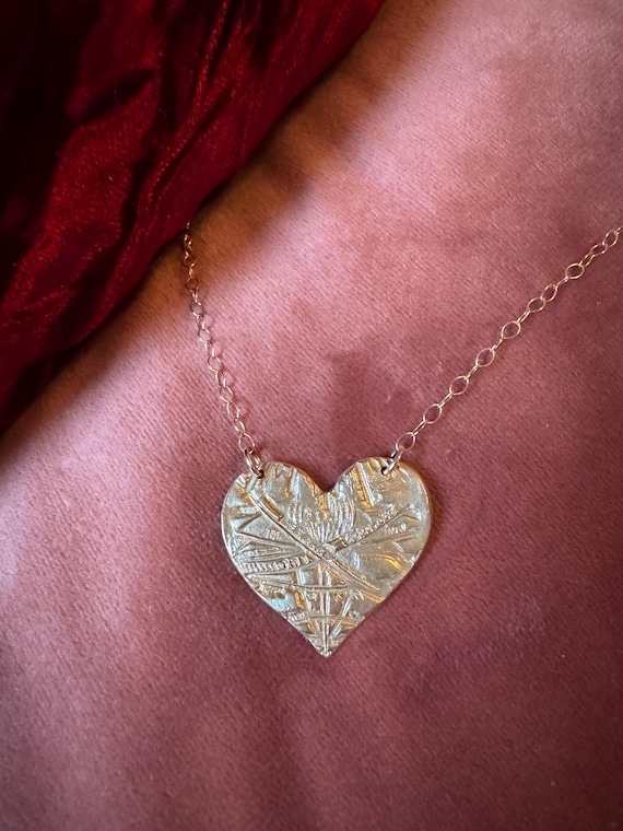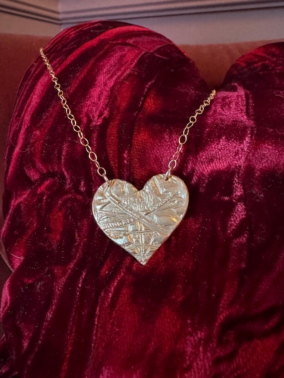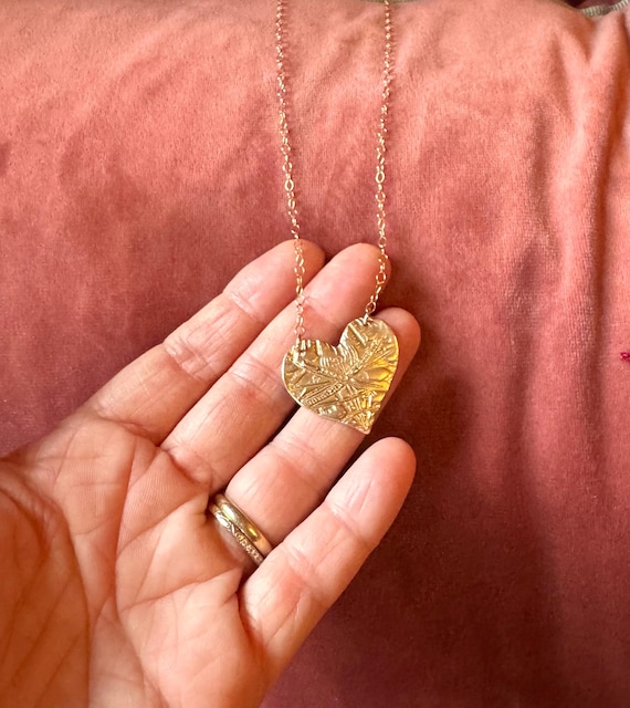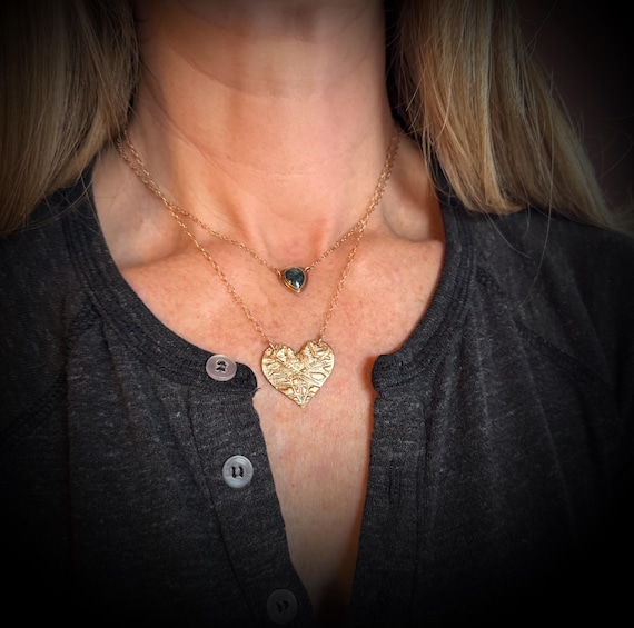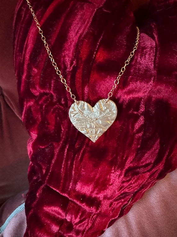 This hand-made bronze medallion features a texturized heart, suspended from a 14k gold filled cable chain which is adjustable from 16-18".