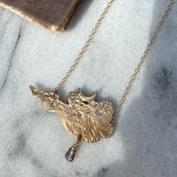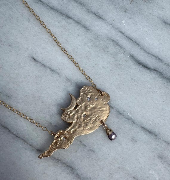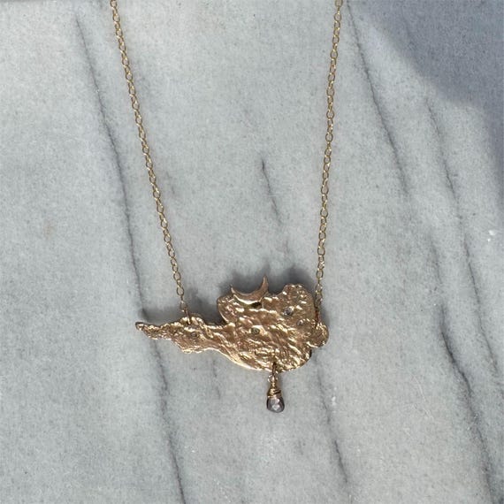 The Night Sky necklace features a hand sculpted bronze cloudscape. A crescent moon and tiny cz stars peek out of the graceful cloud. A soft grey spinel gemstone drop dangles below and hints at rain. A wearable reminder of the beauty that surrounds us. Bronze pendant is approximately 1.75x1” and the 14k gold filled chain is adjustable 16-18”.