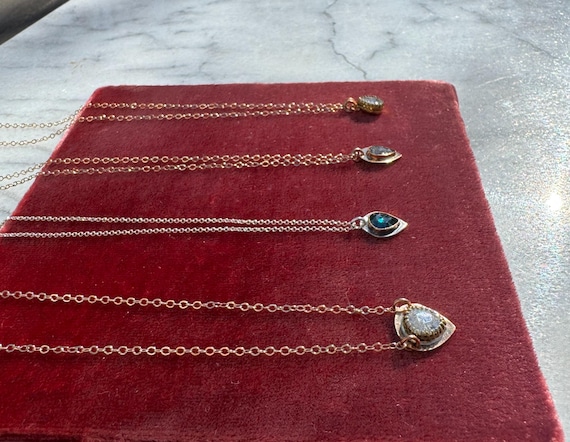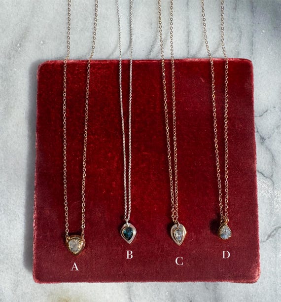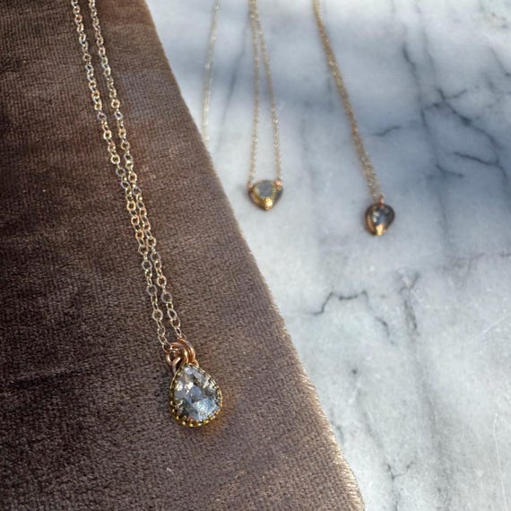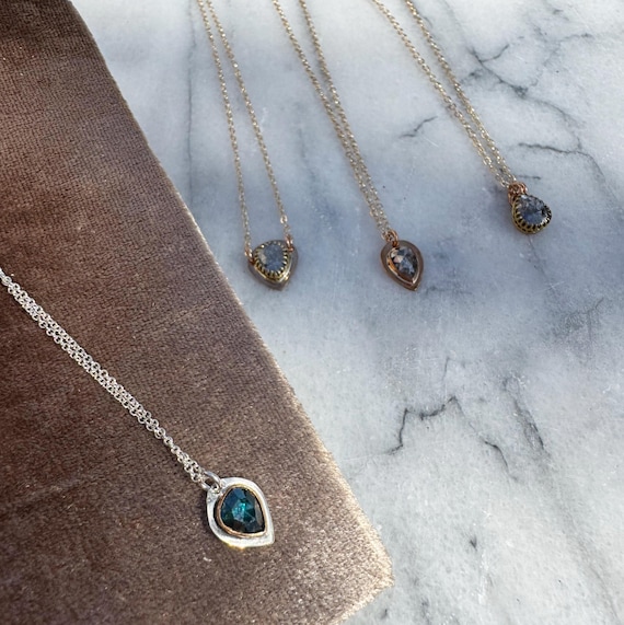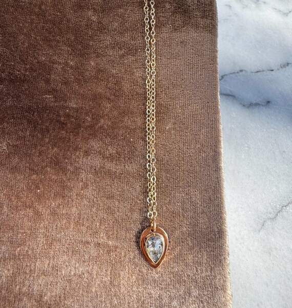 D. Salt and pepper pear shaped diamond set in bronze with adjustable 14k gold filled chain. Pendant is 5