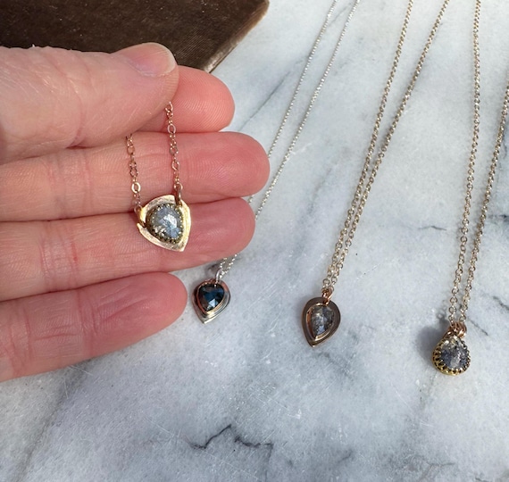 A. Gray/salt and pepper pear shaped diamond set in bronze with a gold-filled adjustable chain. Pendant is 7/8” wide by 1/2” long. Diamond is .5 carat and measures 7.9x9mm
