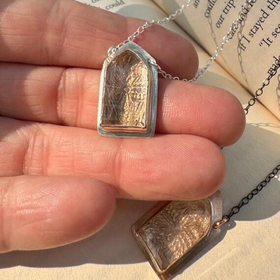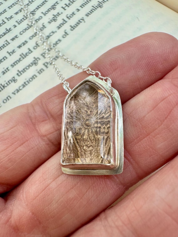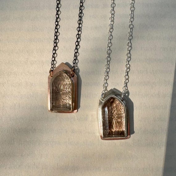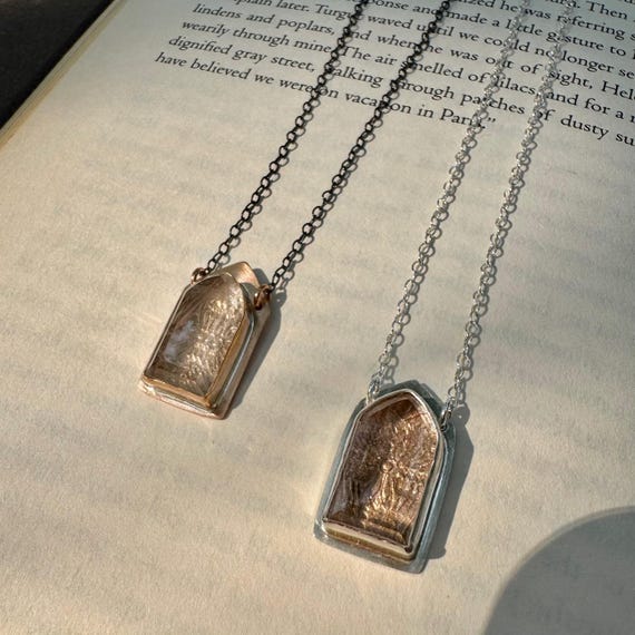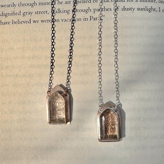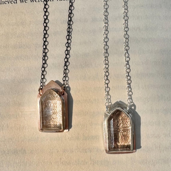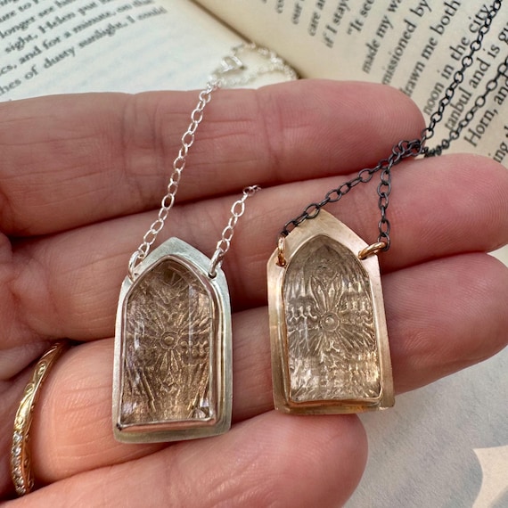 The Altar Necklaces. A faceted crystal quartz gem is bezel set in your choice of bronze or silver. A secret lies under the gemstone window—a view of bronze gothic architectural tracery. Bronze medallion has an oxidized blackened silver chain and the silver medallion chain is bright silver. They are adjustable from 16-18 inches.
