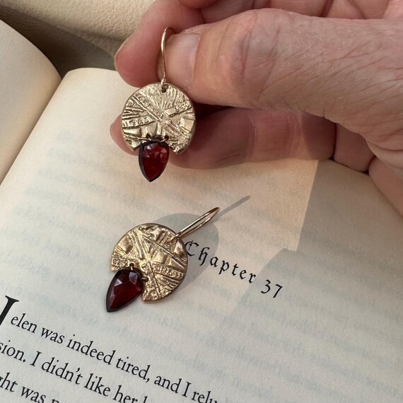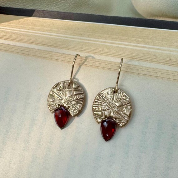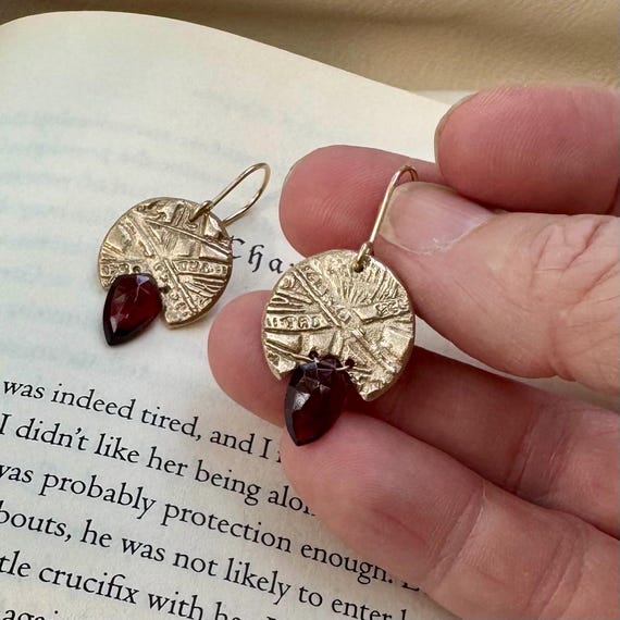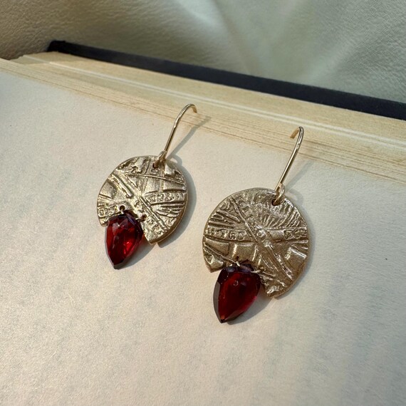 These light weight beauties feature a bronze medallion with an impression of an astrolabe illustration. Adorned with flaming red garnet shields. 14k gold-filled ear wires. From top of ear wire to bottom of gem measure 1 and 3/8 inches. Medallion is 7/8 inch long.