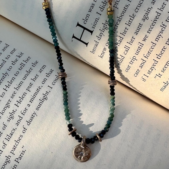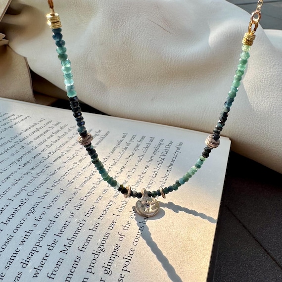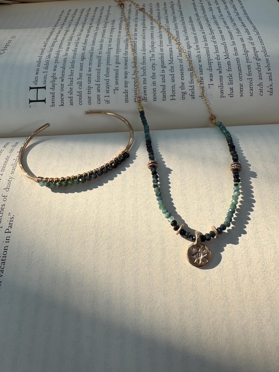 The Autumn Mist necklace. Beautiful blue ombré tourmaline necklace inspired by a stormy autumn night. Adorned with handmade bronze beads and a cz studded bronze pendant. 14K gold filled chain and clasp. Necklace is adjustable 16-18 inches.