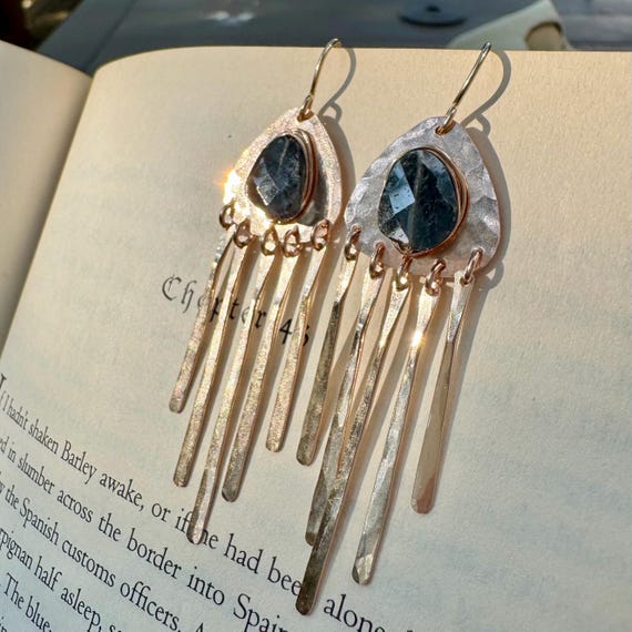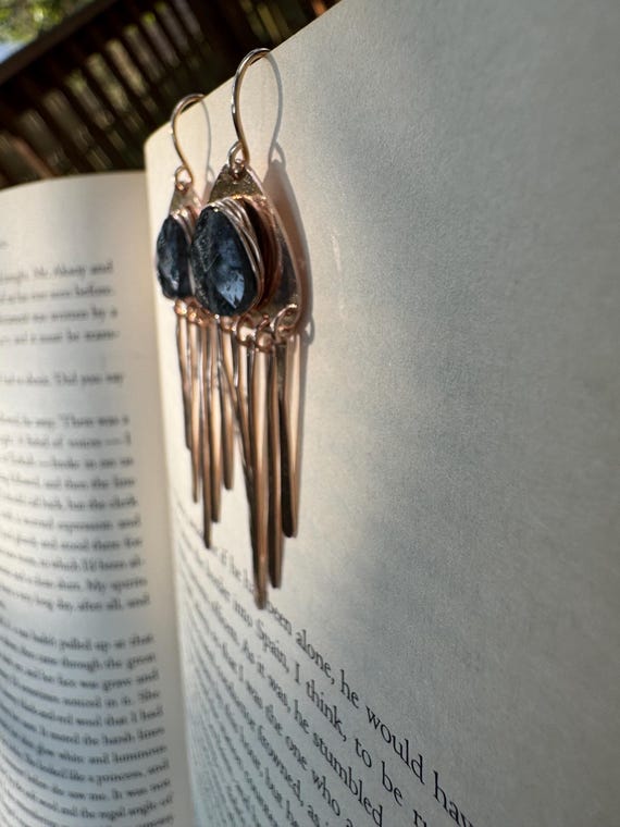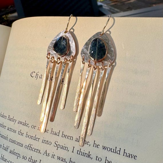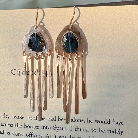 The Delta earrings are created from bronze and feature two sparkling kyanite gemstones and a fringe of bronze dangles. 14k gold filled ear wires. Approximately 2.5” long.