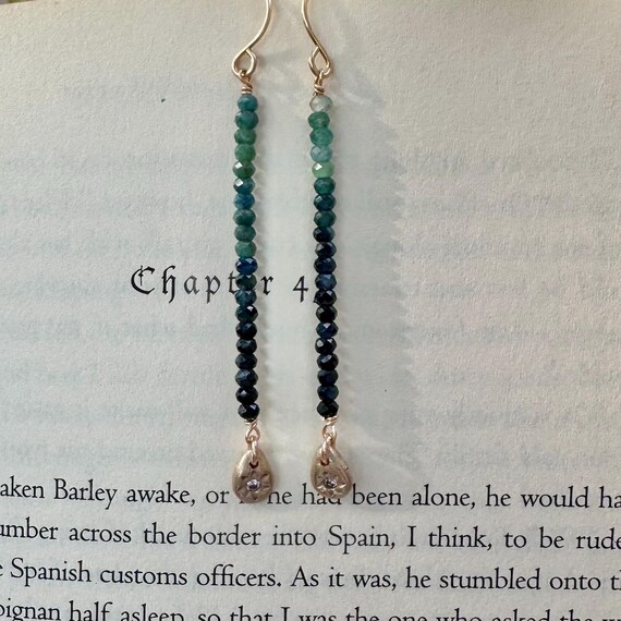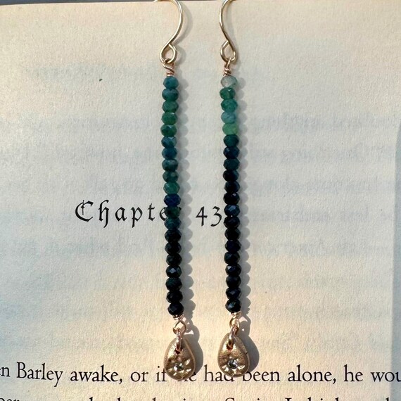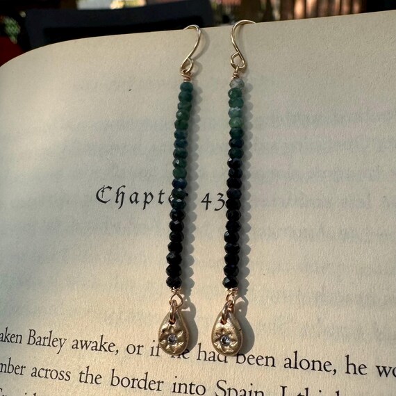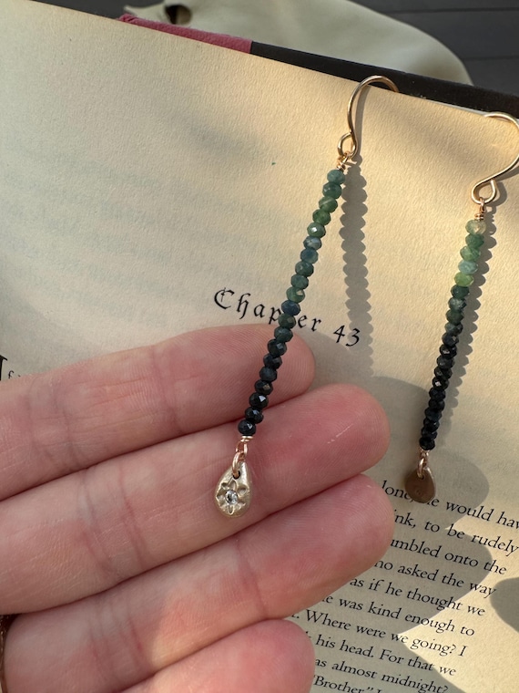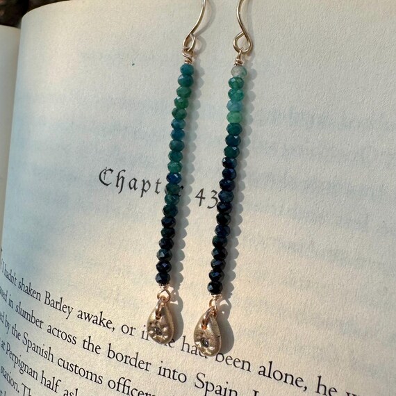 These light weight and sparkly blue ombré indicolite earrings feature a handmade bronze drop studded with a cz. 14k gold filled ear wires. Approximately 2.25 inches long.