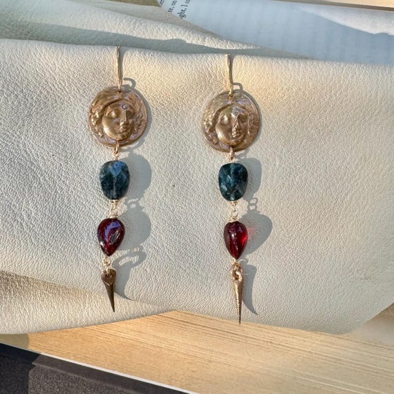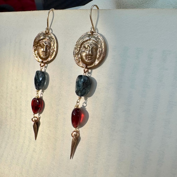 These elegant earrings feature our bronze medallion of the goddess Athena in relief—Athena’s wisdom. Kyanite and garnet beads are finished with a bronze spear shaped bead. 14k gold filled ear wires. Approximately 2.75” drop length. These earrings will bring you wisdom along with beauty.