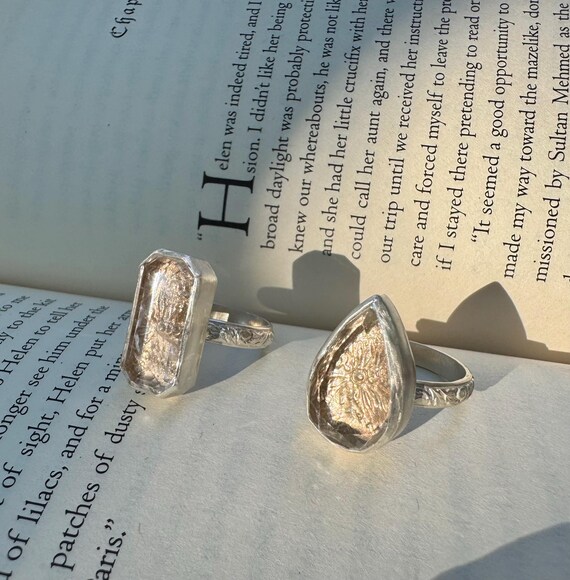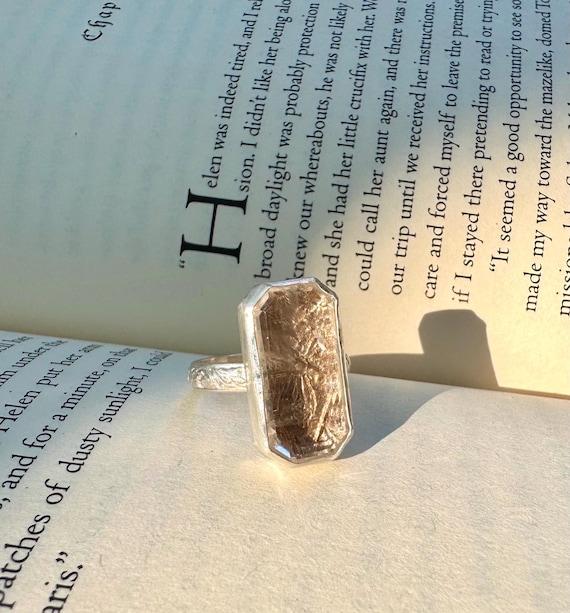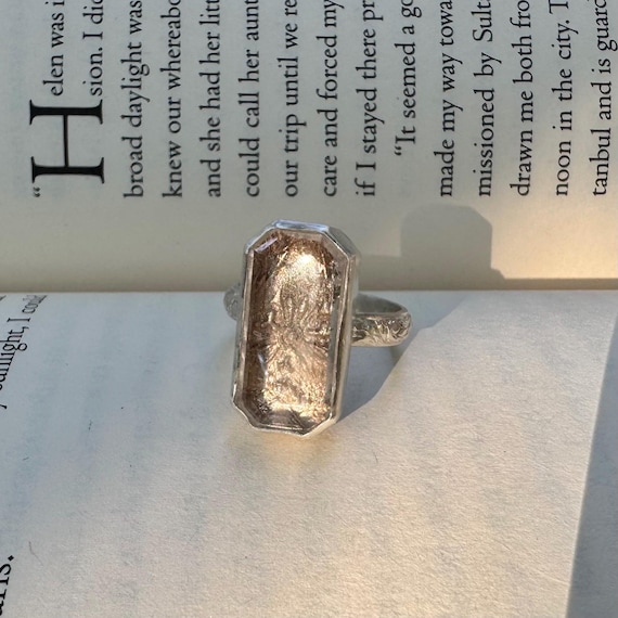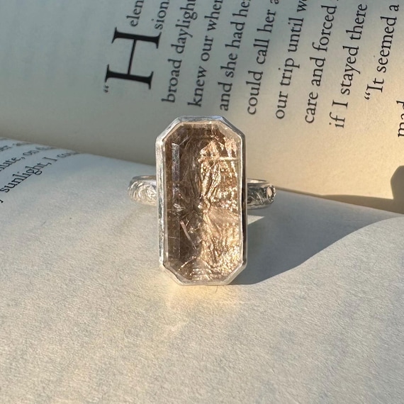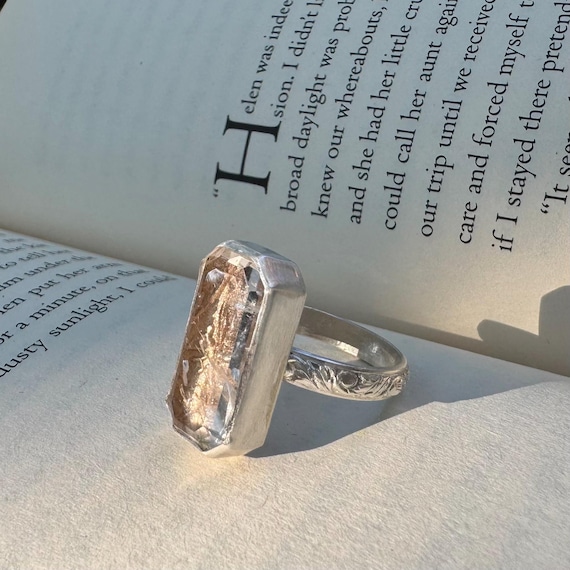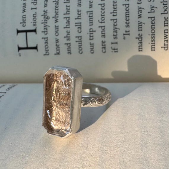 An octagonal crystal quartz gem is surrounded in brushed sterling silver and carries a secret. The crystal allows a glimpse of bronze cathedral tracery below. The ring band features a scrolling vine pattern. Magical. Top of ring setting measures approximately 7/8” x 1/2”.