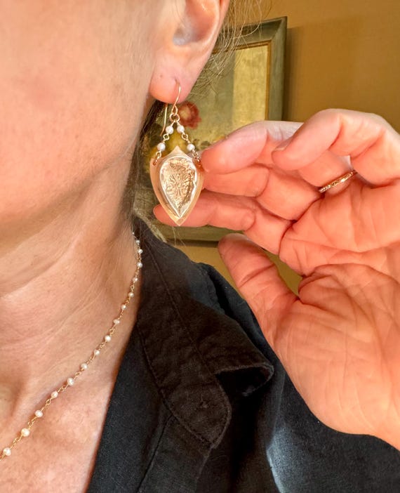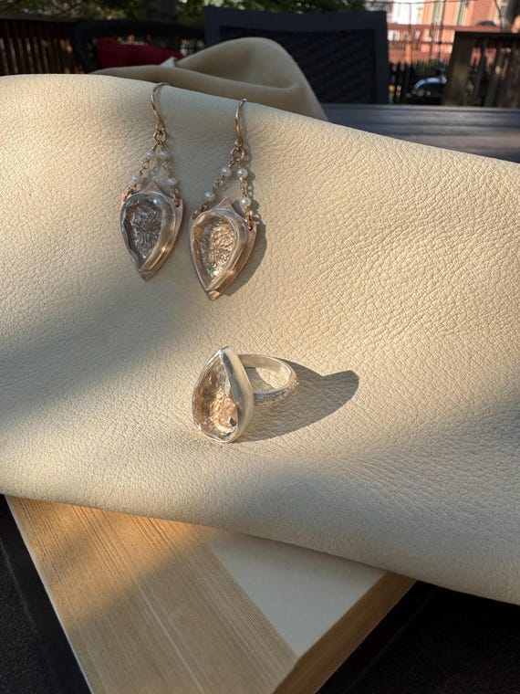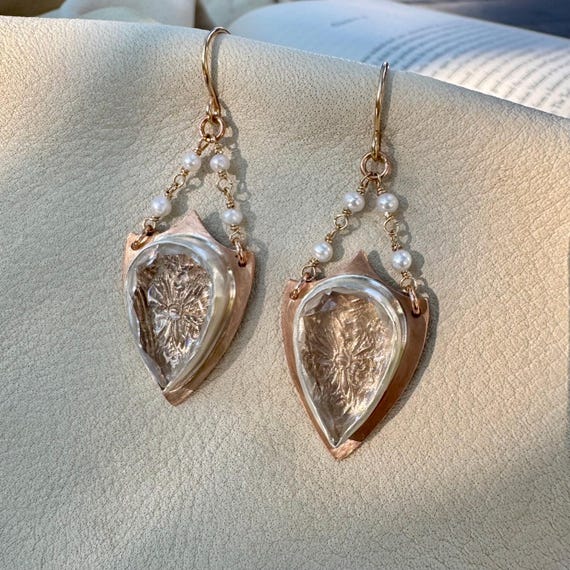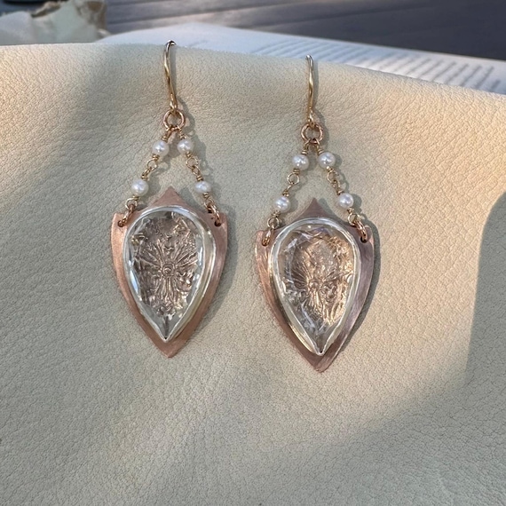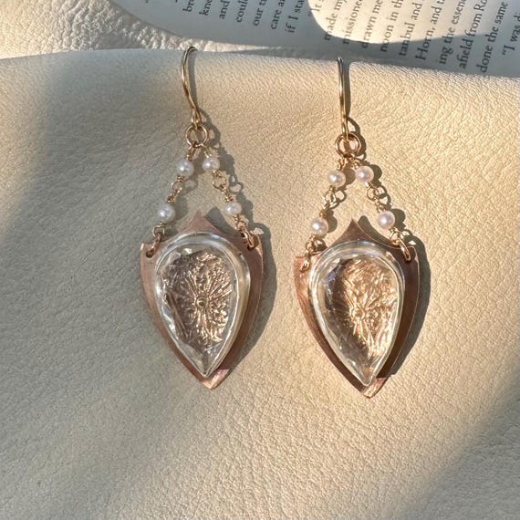 The Fairytale earrings. Crystal clear quartz faceted gemstones are surrounded in brushed sterling silver backed by bronze shields. And they carry a secret. The crystal allows a glimpse of bronze cathedral tracery below. Glossy white pearls top the settings. 14k gold fill ear wires. Length is 1 5/8”. Perfect for your fairytale wedding or your daily magical vibe.
