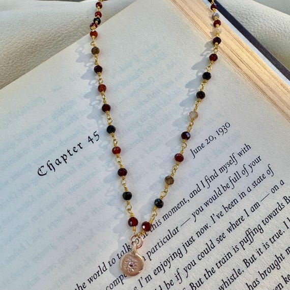 Various autumnal hued sparkling gemstones glow like cascading fall leaves! Accented with a minimalist bronze cz studded starburst medallion. Adjustable length 16-18 inches.