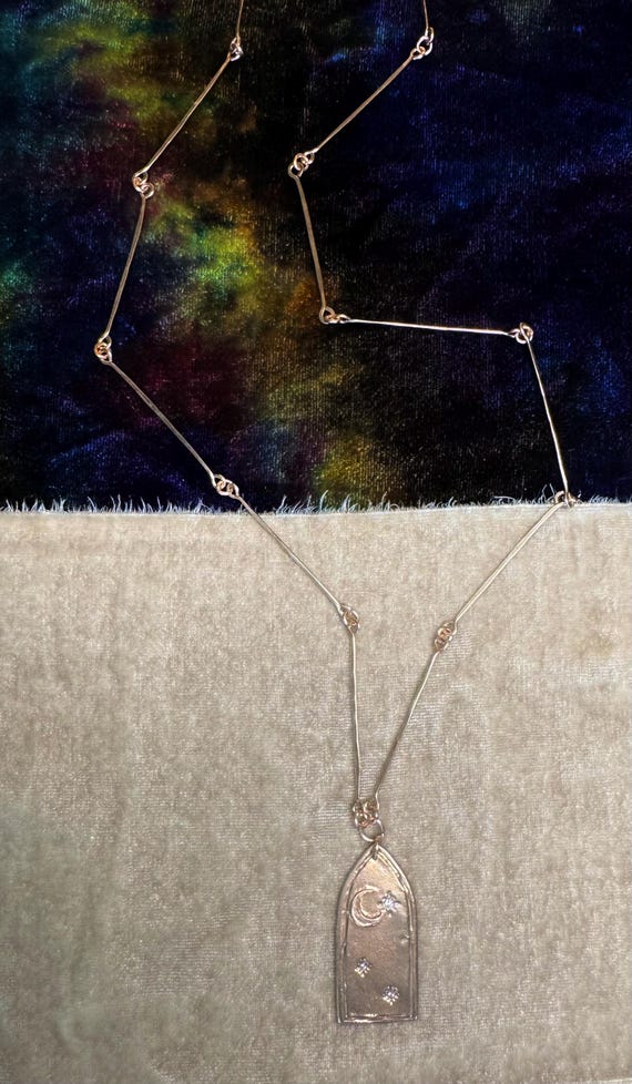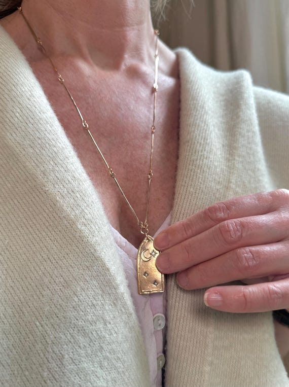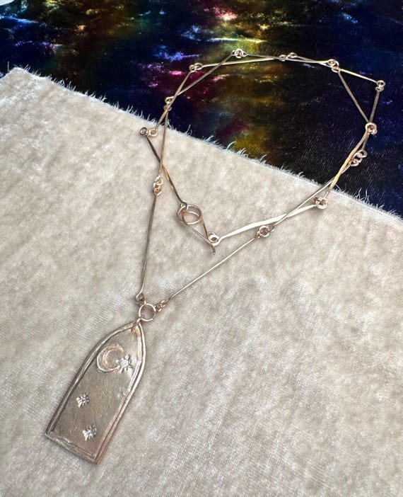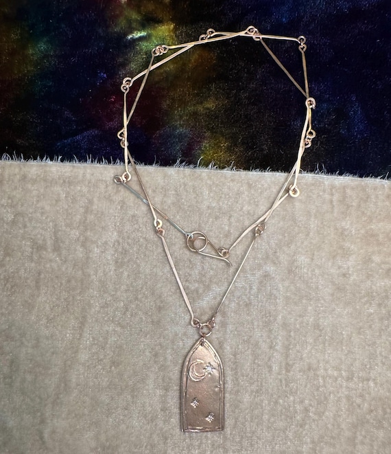 A long bronze statement of hand-hammered chain links and hand sculpted bronze gothic arched window featuring the most delicate crescent moon and cz studded sparkling stars. We are calling this piece “The Tower” and it’s our take on the tarot symbolism. A view from inside the tower looking out. The chain length is 24” and perfect for layering.