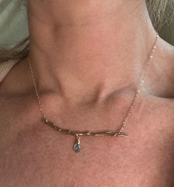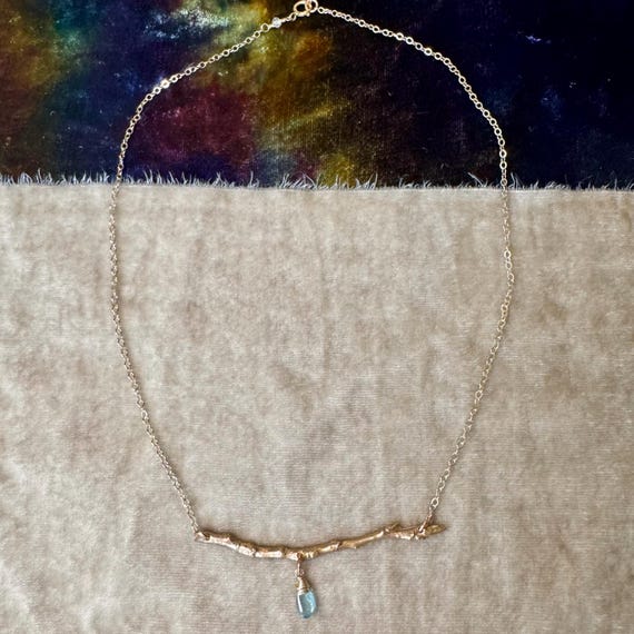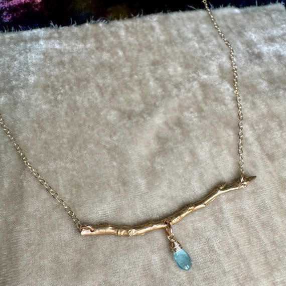 The "Spring Thaw" necklace features our slim, graceful, golden bronze twig that was molded from an aspen twig we found while hiking in Utah. Adorned with a single luminous aqua blue apatite drop and suspended from an 14k gold filled chain. The necklace is adjustable from 16-18".