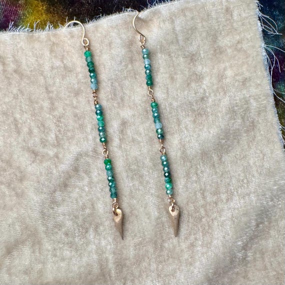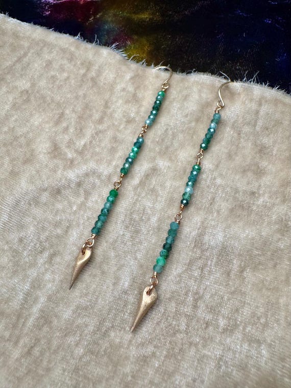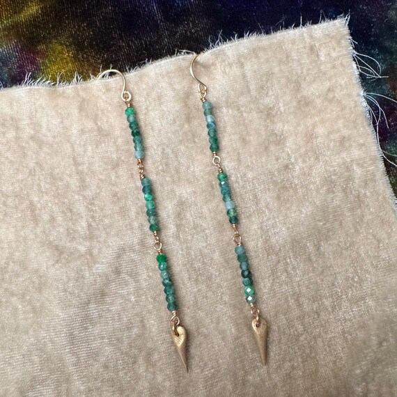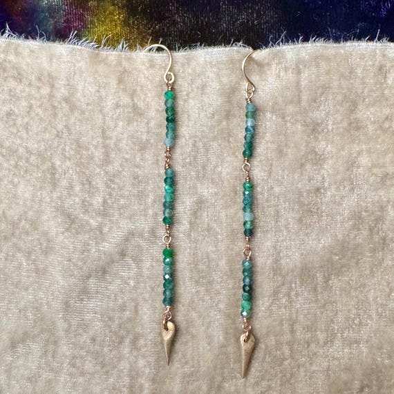 These variegated green jade strands are tipped with bronze spears. Light weight and swingy, these sparkling shoulder dusters are perfect for a festival or concert! 14k gold-filled ear wires. 3.5” long from top of jade to bottom of spikes.
