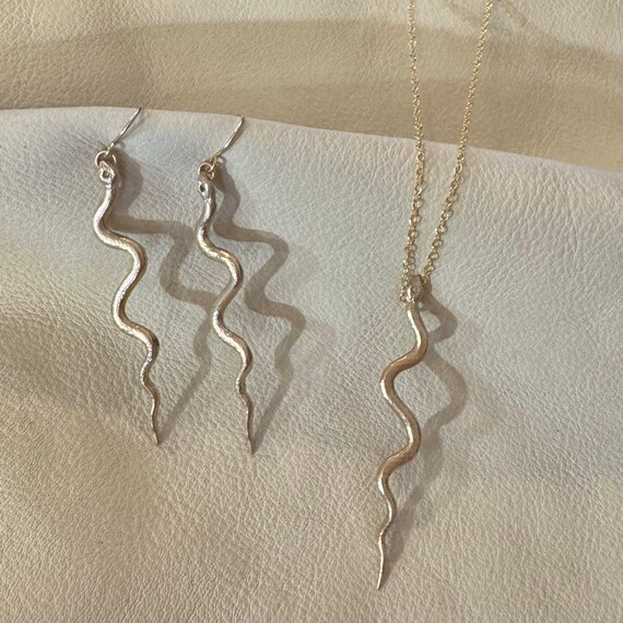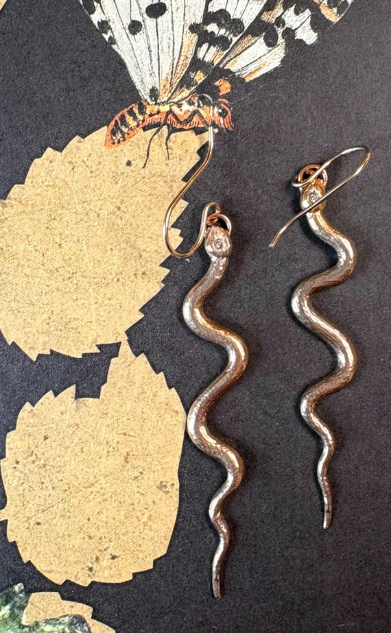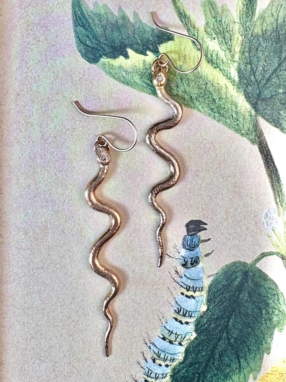 These stunning, golden bronze, textured serpents feature a tiny sparkling cubic zirconia gemstone on their heads. 14k gold filled ear wires. Approximately 2.5” long. Light weight enough for everyday earrings.