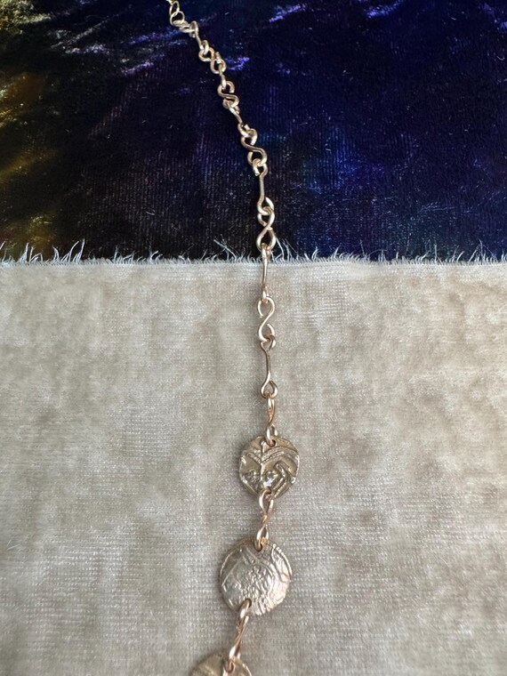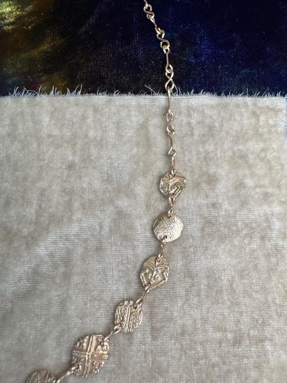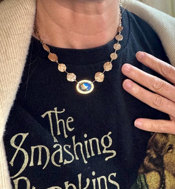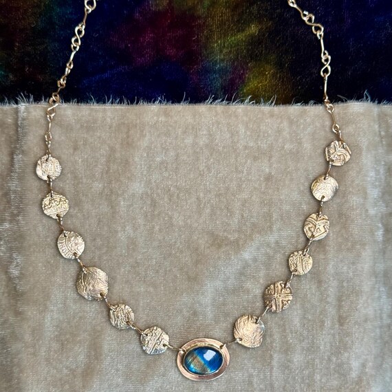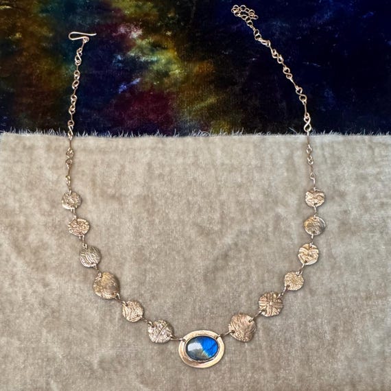 The “Unearthed” necklace consists of a chain of handmade textured bronze ‘coins’ and figure 8 links with a dazzling bronze-set labradorite focal point. Some of the coin elements are accented with tiny cz sparkles. This necklace is truly fit for a queen. As each handmade coin and hand-set labradorite gemstone are unique, please allow for some ever so slight differences from the photos for your unique piece. Pendanr measures approximately 3/4” wide and 5/8” tall. Adjustable 16-18” length.