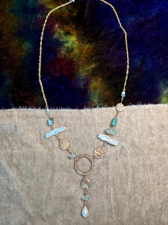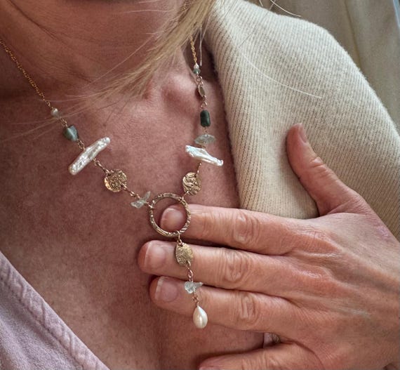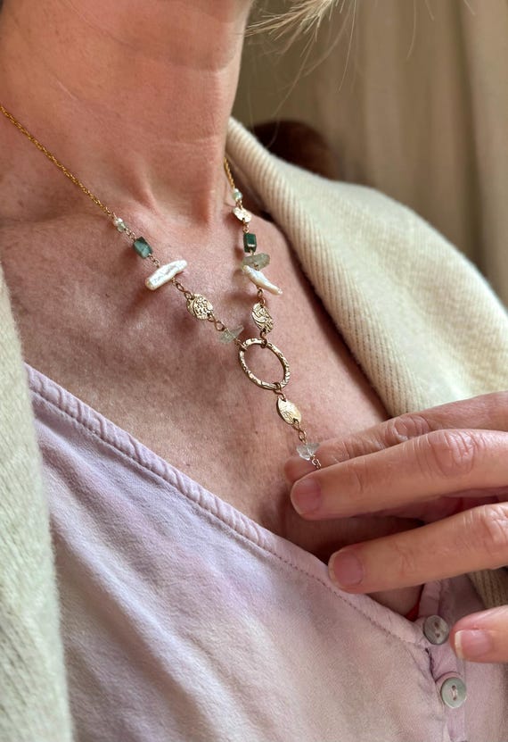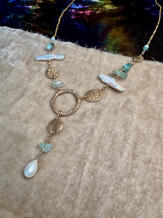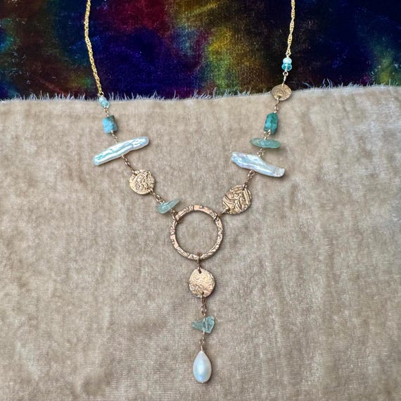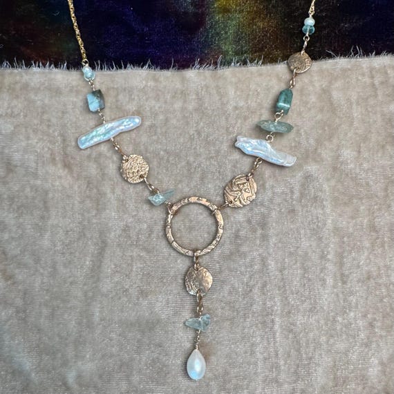 The eclectically regal “Found Object” Y necklace features a constellation of elements, including biwa pearls, Brazilian emeralds, aquamarine and handmade bronze textural ‘coins’ and center ring detail with a drop of more mixed gems. 14k gold-filled woven wheat chain. Length is adjustable 18-20” with 1.5” drop from ring.