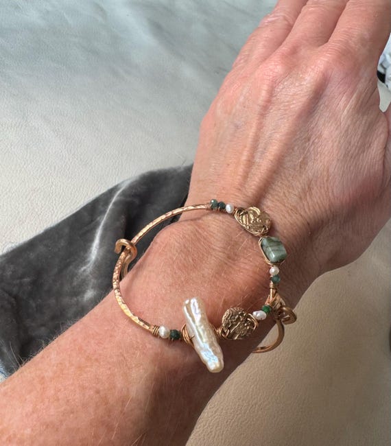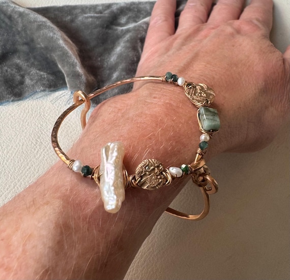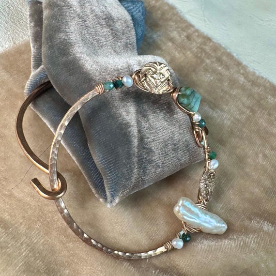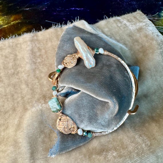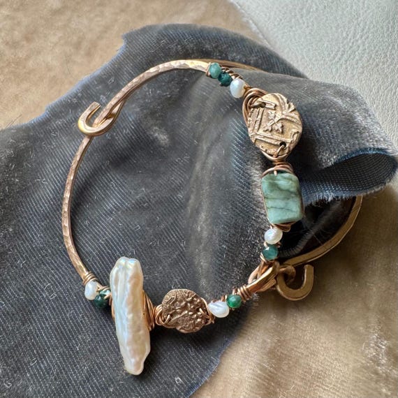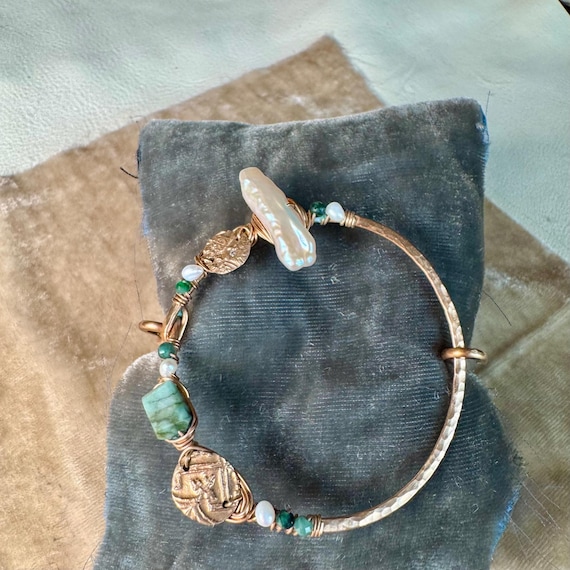 The eclectically regal “Found Object” cuff is hand formed from bronze and wire wrapped with a constellation of elements, including biwa pearls, sparkling jade, Brazilian emeralds and handmade bronze textural ‘coins’ accented with tiny sparkling cz. Fits most wrists as it opens and closes with a hinge and clasp.