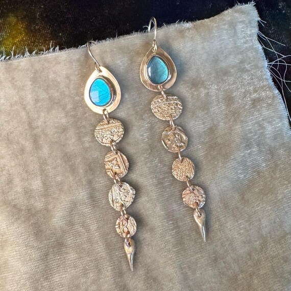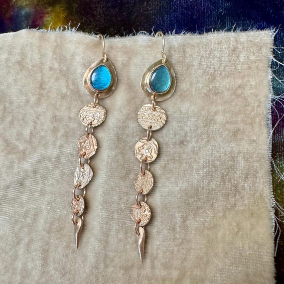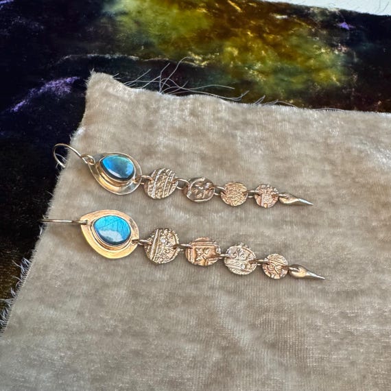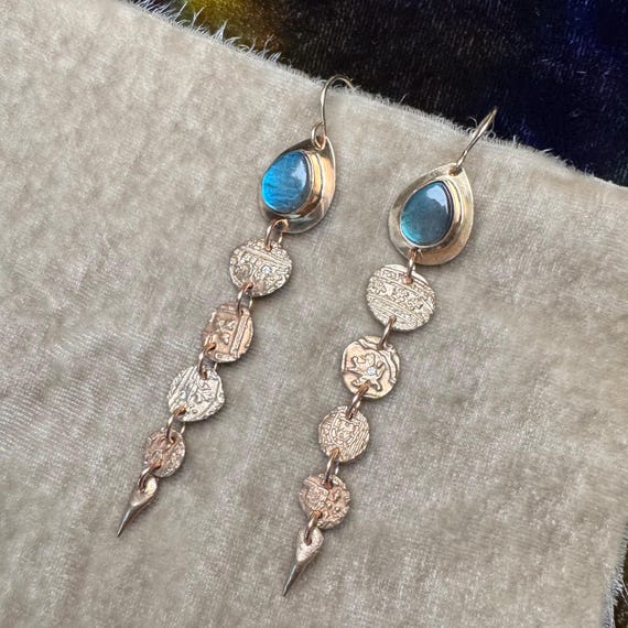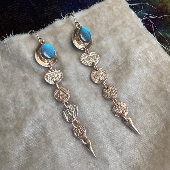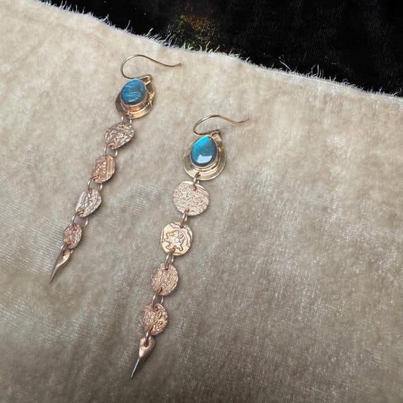 The “Unearthed” earrings consist of a chain of handmade cascading bronze ‘coins’ and is topped with a dazzling bronze-set labradorite focal point. Some of the coin elements are accented with tiny cz sparkles. These earrings are truly fit for a queen. 14k gold filled ear wires. As each handmade coin and hand-set labradorite gemstone are unique, please allow for some ever so slight differences from the photos for your unique pieces. Approximately 2.75” long.