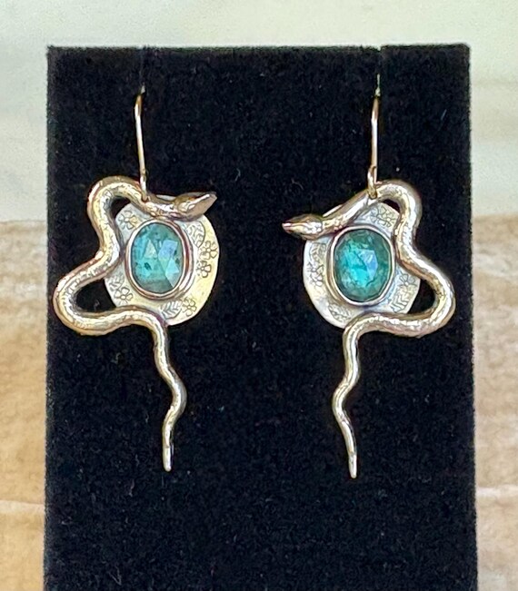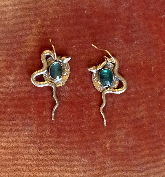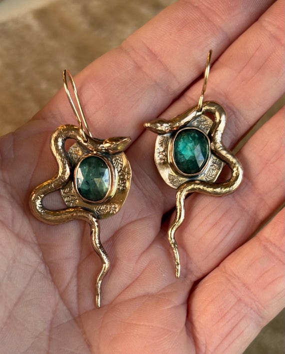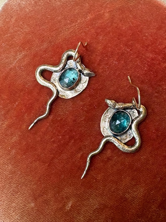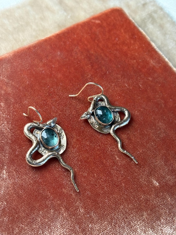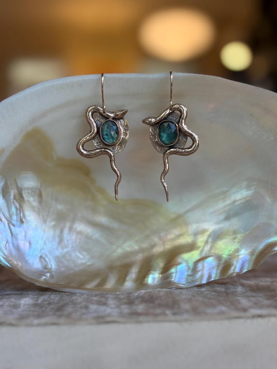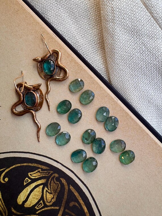 *Each pair are completely hand fabricated and as such are one of a kind. Please allow for slight variations in serpent alignment and gemstone hue. The kyanite vary in color some, but are all in the sea green family. Please feel free to message us if you would like to select specific gems.*