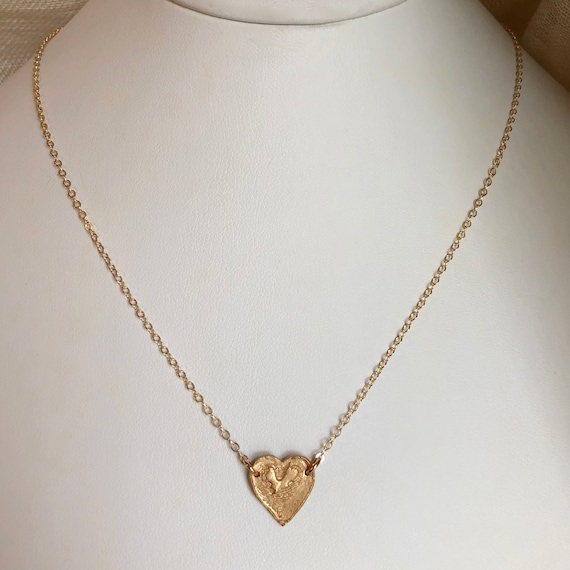 This hand-made bronze medallion features a small heart, suspended from a fine 14k gold filled cable chain which is adjustable from 16-18".